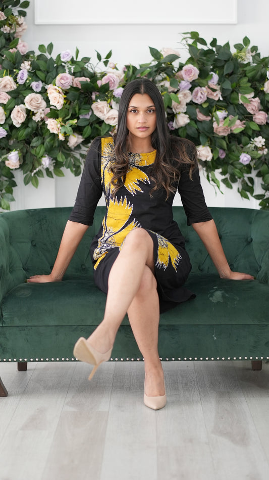 CC0042- Black & Yellow Flower Short Batik Dress | Ceylon Batik | Hand Made | Summer Collection | Cotton Dress | Summer Wear