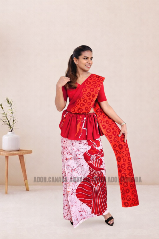 MU1571|Red with white and red lady designed Kandyan Made-up|Ceylon Batik| Cotton Kandyan Made-up Saree| Exclusive Designer Wear | Kandyan Made-up