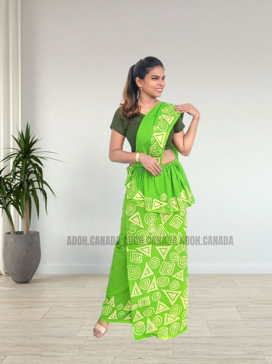 MU1568|Apple green with off-white shapes designed Kandyan Made-up|Ceylon Batik| Cotton Kandyan Made-up Saree| Exclusive Designer Wear | Kandyan Made-up
