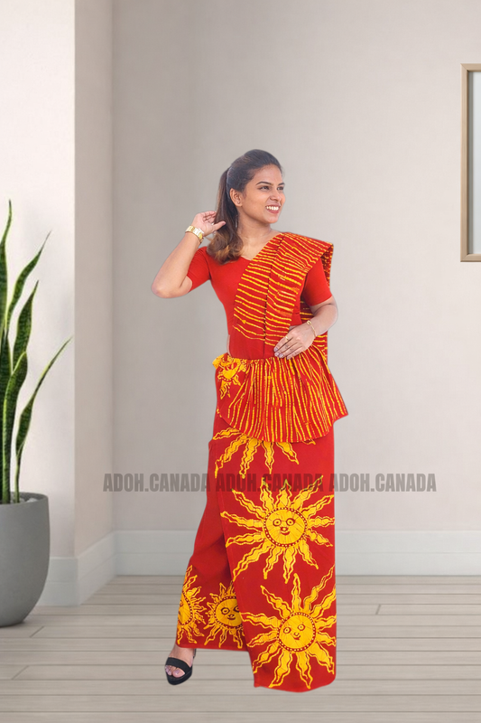 MU1570|Red with yellow sun designed Kandyan Made-up|Ceylon Batik| Cotton Kandyan Made-up Saree| Exclusive Designer Wear | Kandyan Made-up
