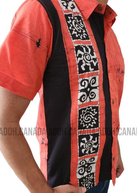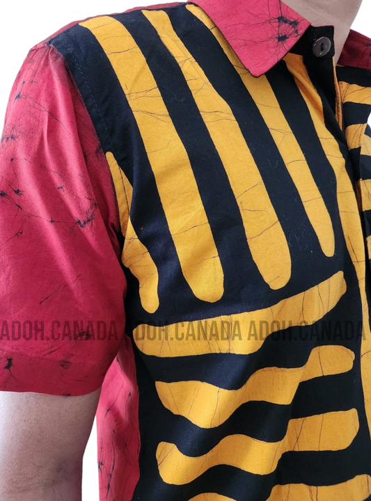 SH1143 - Black and yellow designed Red Batik Shirt | Ceylon Batik | Hand Made | Men's Collection | Cotton Shirt | Summer Wear