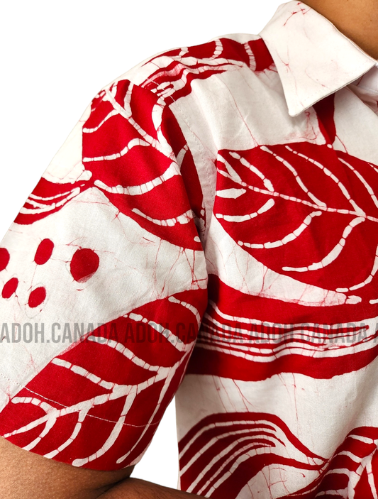SH1152 - Red and white leafy designed Batik Shirt | Ceylon Batik | Hand Made | Men's Collection | Cotton Shirt | Summer Wear