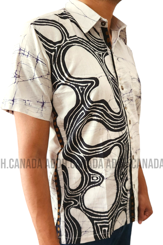 SH1269 - White Batik shirt with Black and white zig zag designed | Ceylon Batik | Hand Made | Men's Collection | Cotton Shirt | Summer Wear