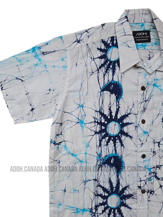 SH901 - White Sun Moon Batik shirt with light blue and dark blue Cracks design | Ceylon Batik | Hand Made | Men's Collection | Cotton Shirt | Summer Wear