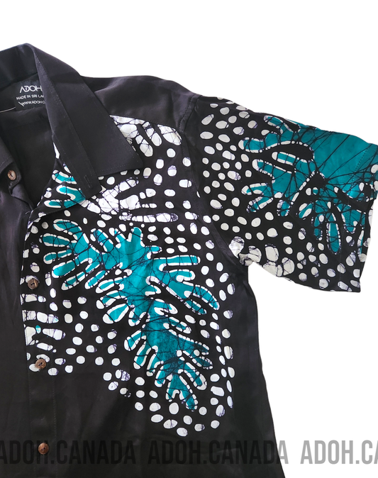 SSH623 - Black Silk Shirt with Green and White Design | Ceylon Batik | Hand Made | Men's Collection | Silk Shirt | Summer Wear | Party Wear