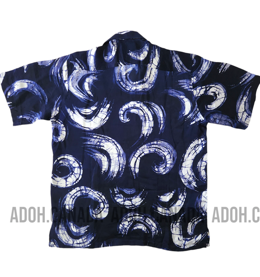 SSH624 - Dark Blue Silk Shirt with White Design | Ceylon Batik | Hand Made | Men's Collection | Silk Shirt | Summer Wear | Party Wear