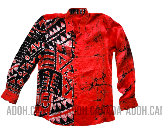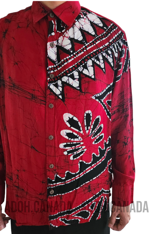 SSH653 - Red Silk Shirt with Black & White Design | Ceylon Batik | Hand Made | Men's Collection | Silk Shirt | Summer Wear | Party Wear