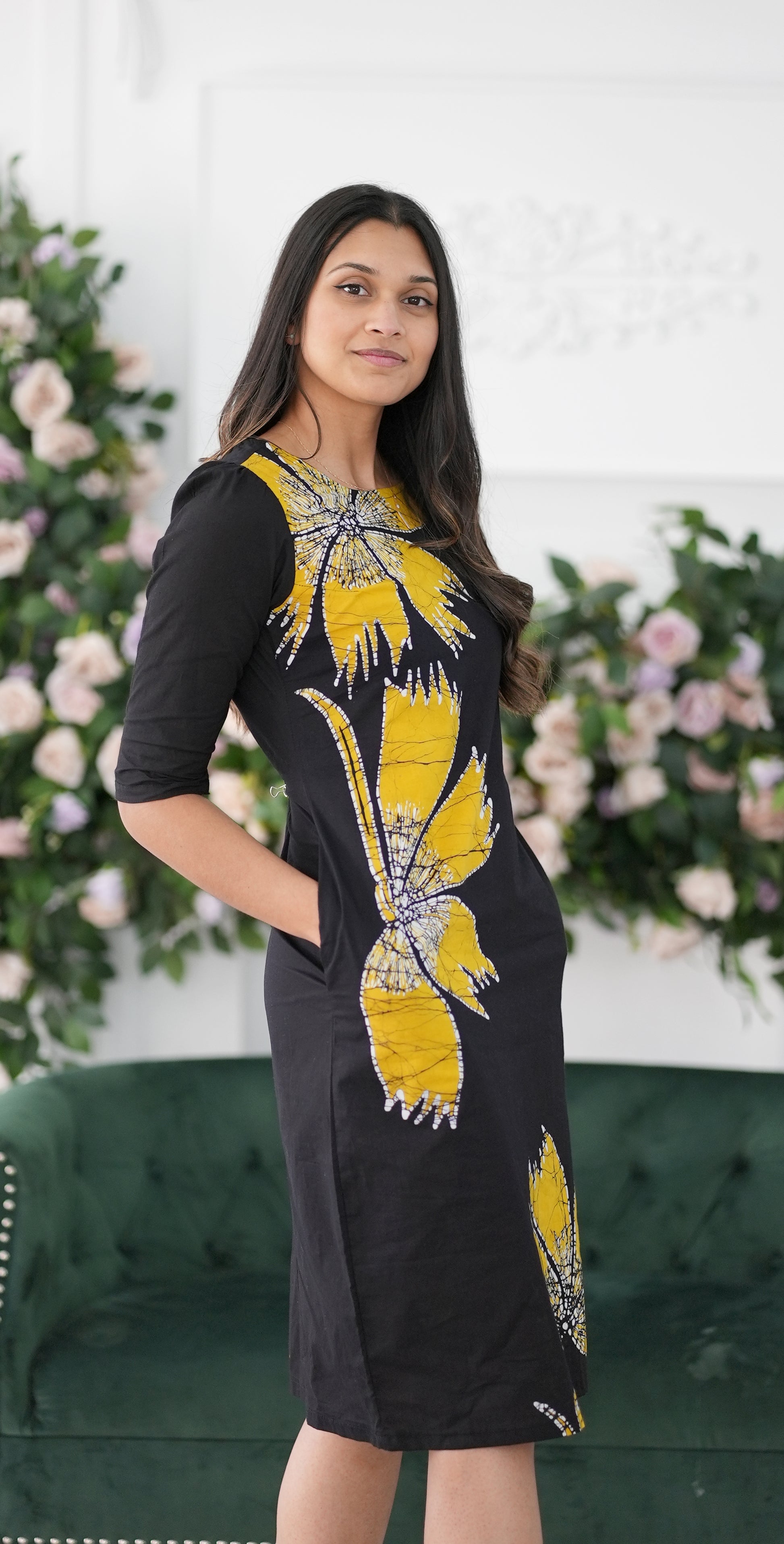 CC0042- Black & Yellow Flower Short Batik Dress | Ceylon Batik | Hand Made | Summer Collection | Cotton Dress | Summer Wear