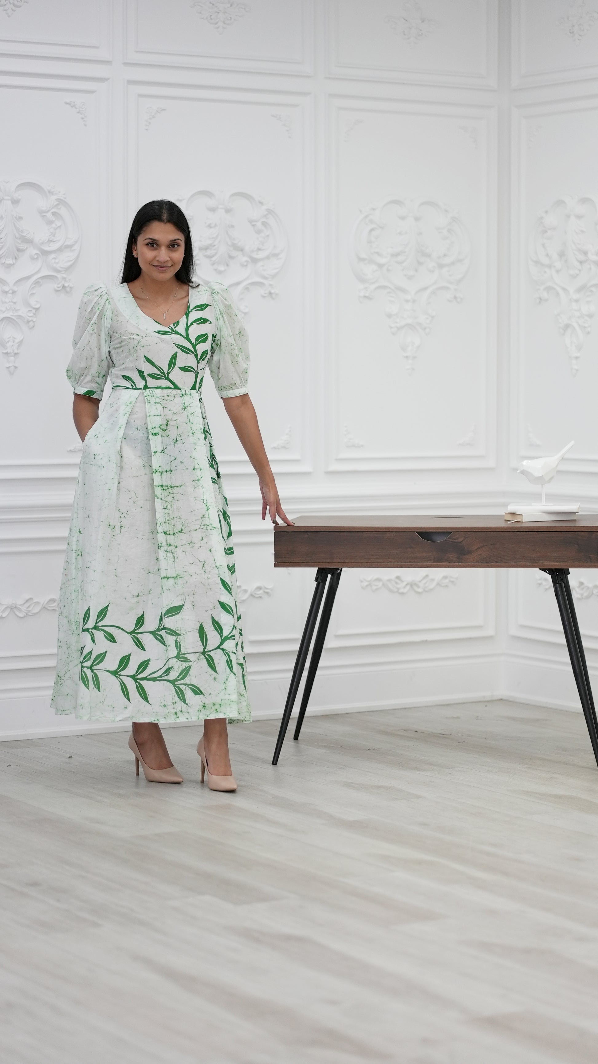 CC0067 - Green Leaves Long Batik Dress | Ceylon Batik | Hand Made | Summer Collection | Cotton Dress | Summer Wear