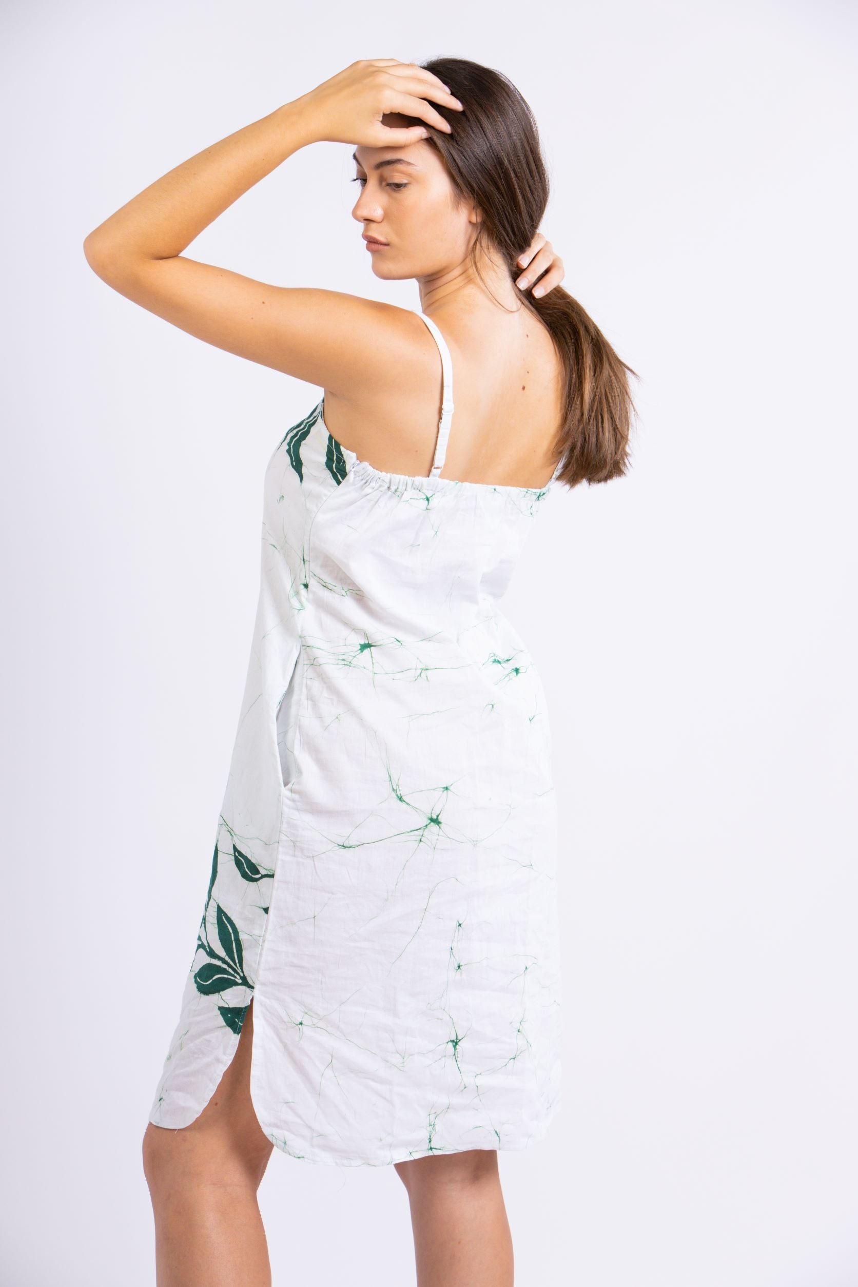 CC0065- Green Leaf White Short Batik Dress | Ceylon Batik | Hand Made | Summer Collection | Cotton Dress | Summer Wear
