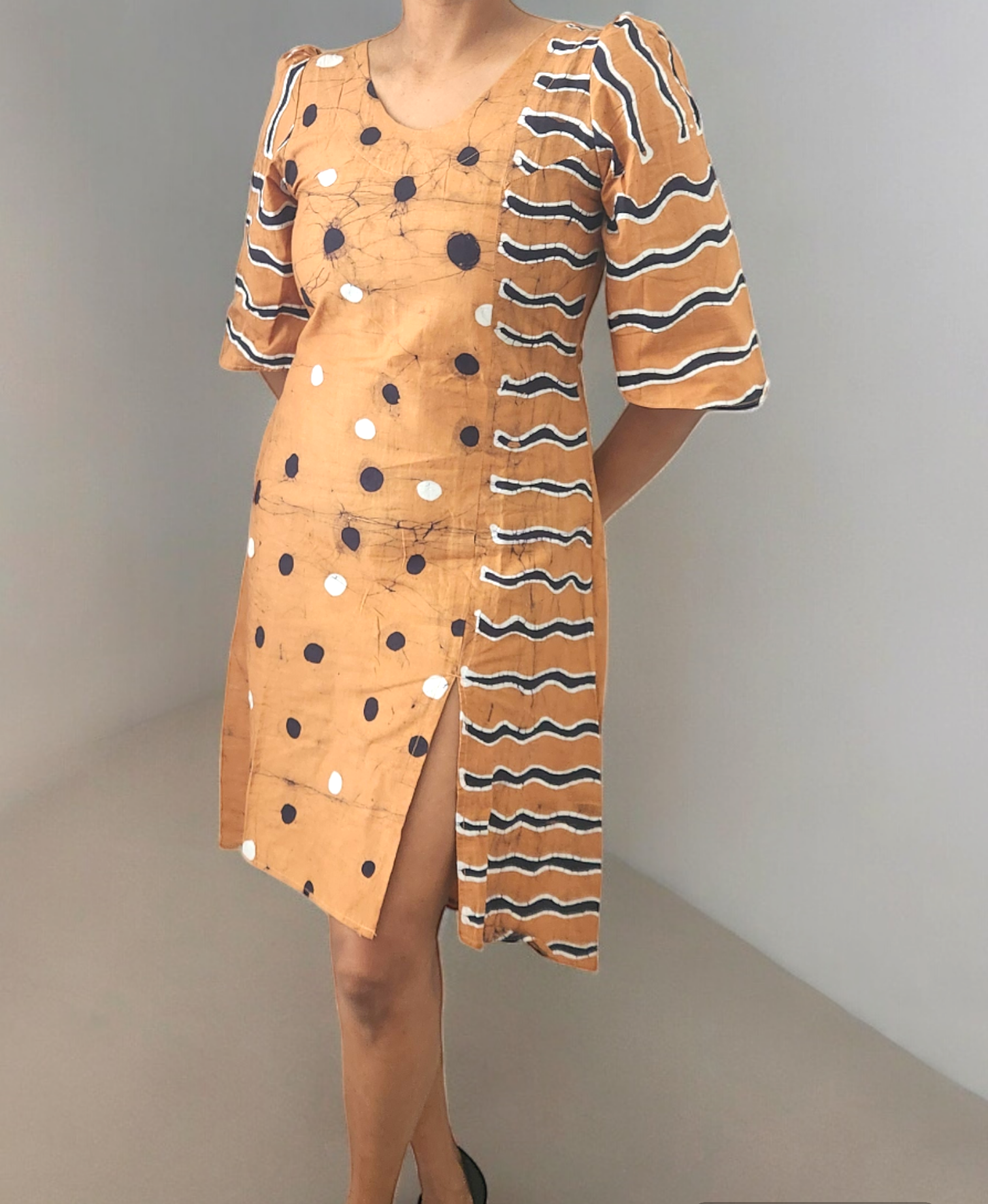 CC1142- Light brown Batik Dress with round designs and cracks | Ceylon Batik | Hand Made | Summer Collection | Cotton Dress | Summer Wear