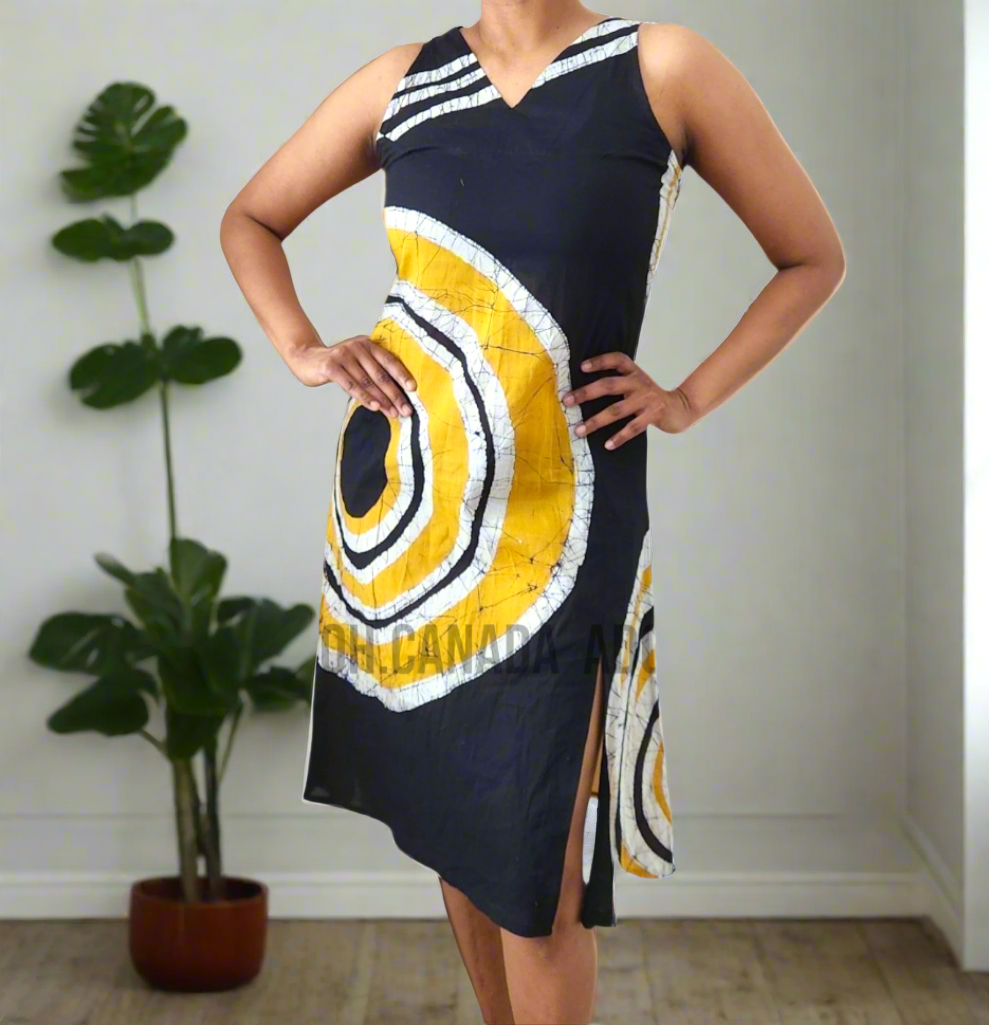 CC0536- Yellow Batik Dress with black and white round design | Ceylon Batik | Hand Made |Summer Collection | Cotton Dress | Summer Wear