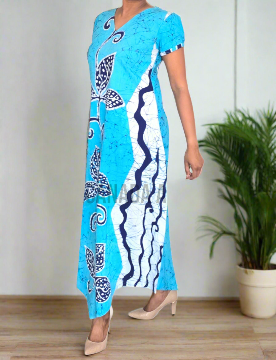 The Elegant design of this dress is 100% handmade by a Sri Lankan Batik artist using traditional batik methods.