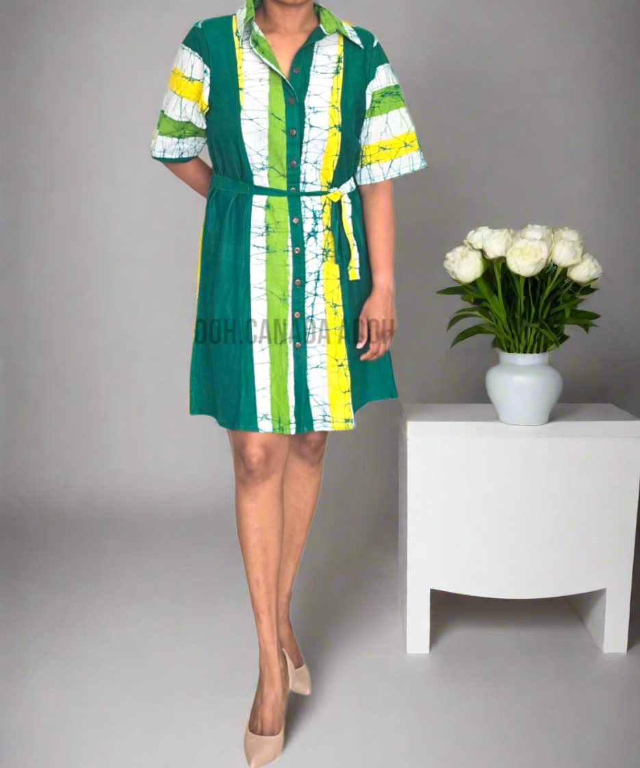 CC1171- Green Batik Shirt Dress with white & yellow striped design | Ceylon Batik | Hand Made |Summer Collection | Cotton Dress | Summer Wear