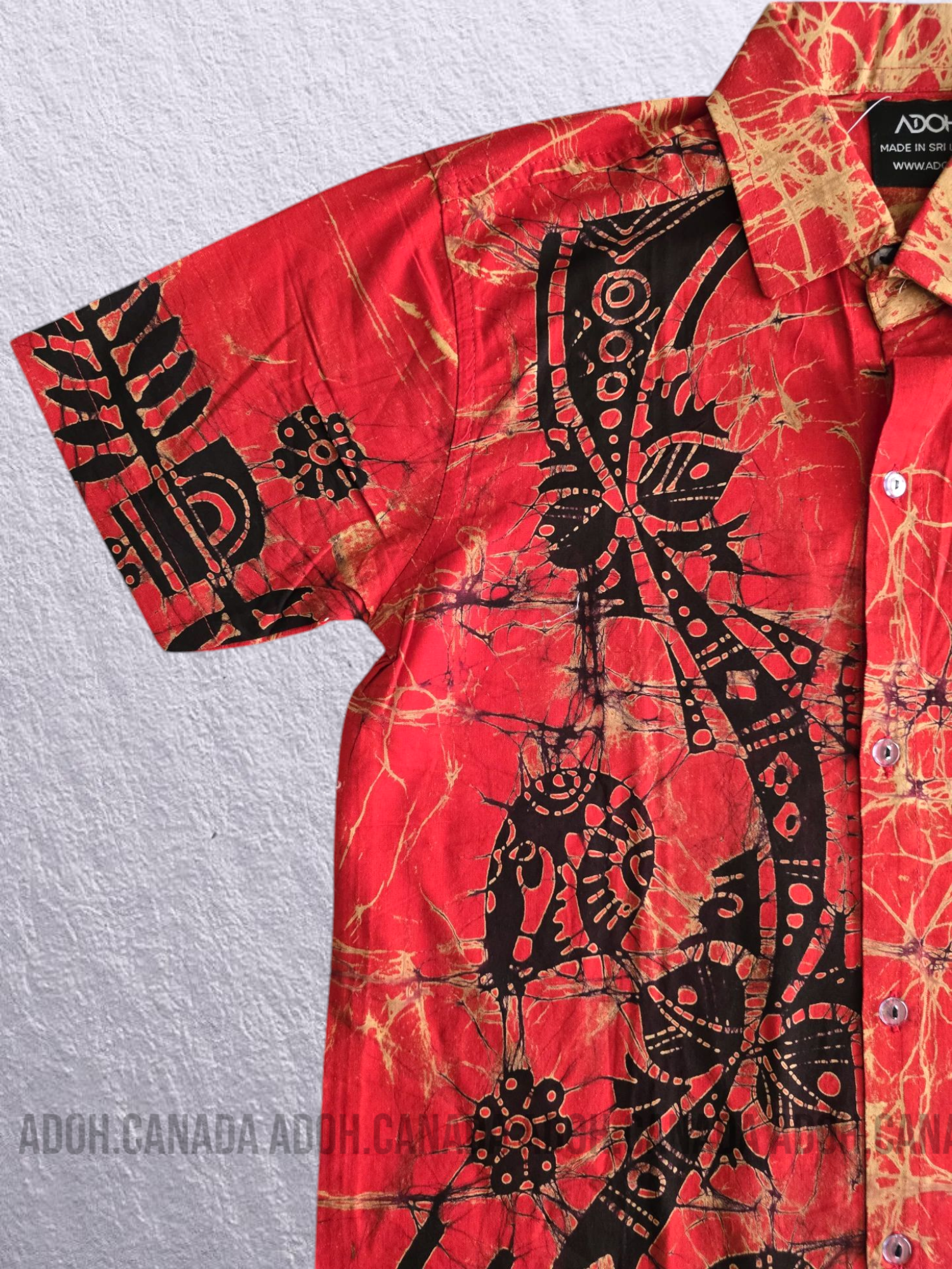 The stylish design of this shirt is 100% handmade by a Sri Lankan Batik artist using traditional batik methods.