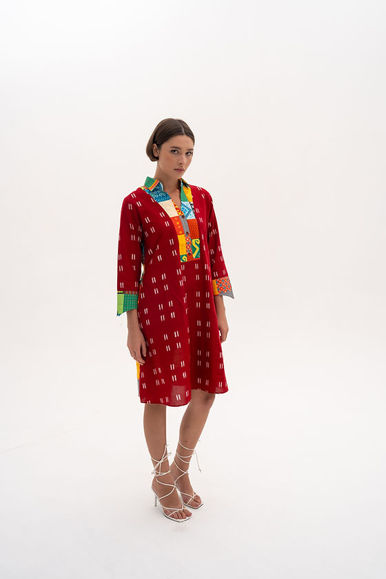 Comfortable midi dress with red motif and patchwork. Medium-length sleeves with shirt collar. Front-top button fastening.
